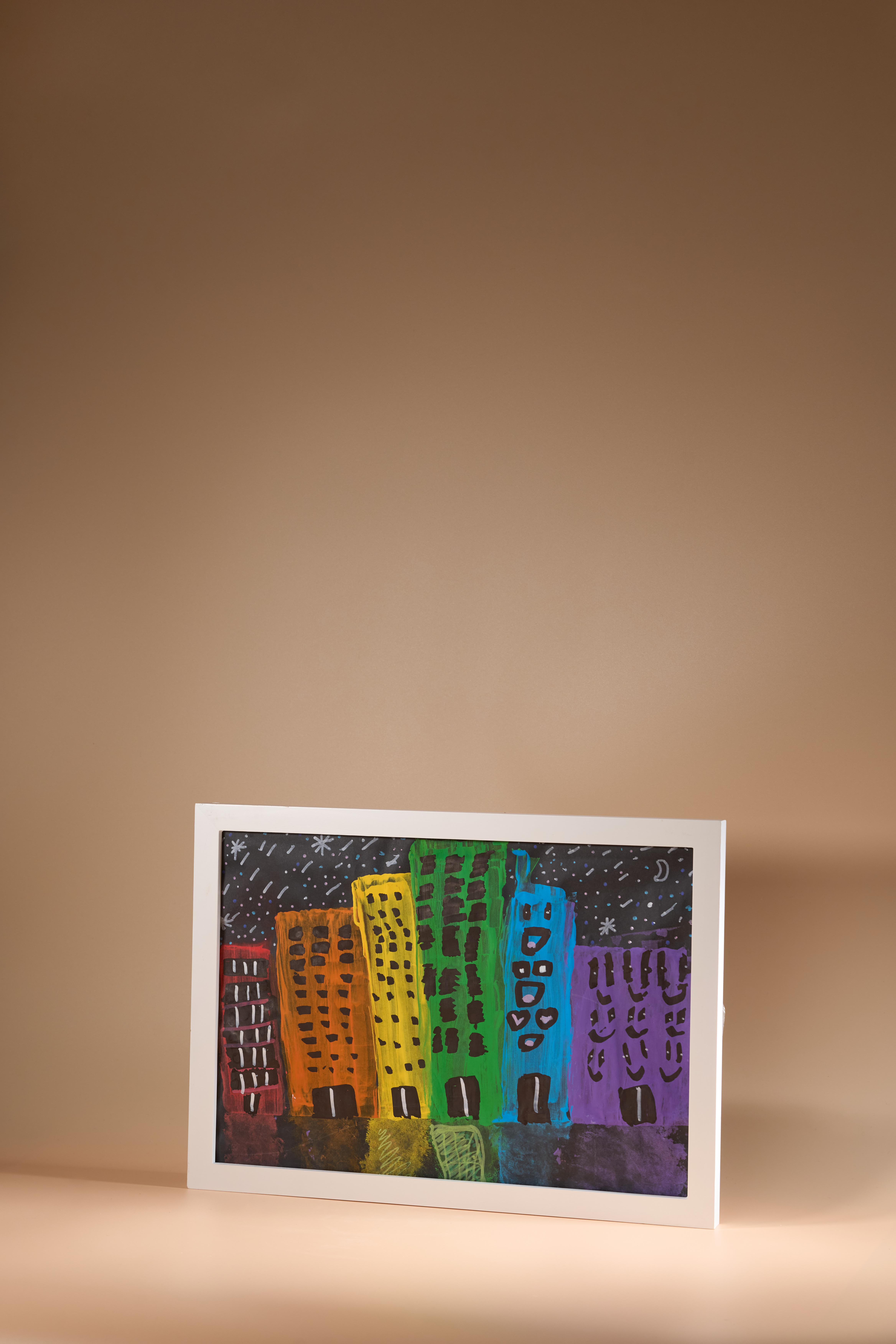 作者幻想中的維港,大廈變得七彩繽紛,而且有表情有生命,象徵多元、希望與和諧。建築物上的黑色窗戶與門,以及藍色大廈上的心形圖案,為畫面增添溫暖細節。背景中的星空與新月營造出寧靜氛圍,使整體畫面充滿幻想與詩意;是一幅充滿情感和創意的作品。
