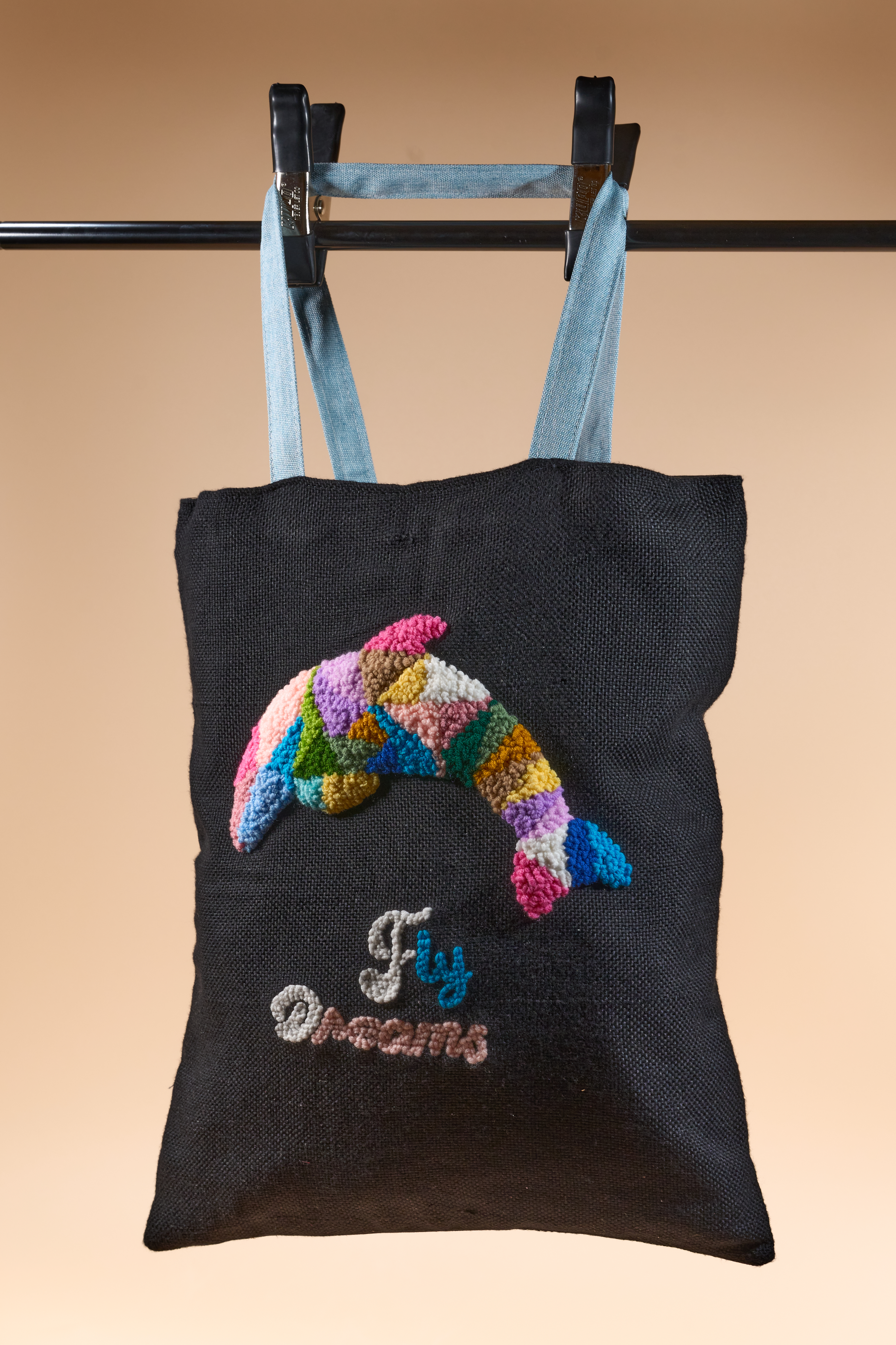 以充滿心思的俄式刺繡展現海豚躍出水上的動感姿態,加上大膽的彩色拼湊造型,令人一見難忘。