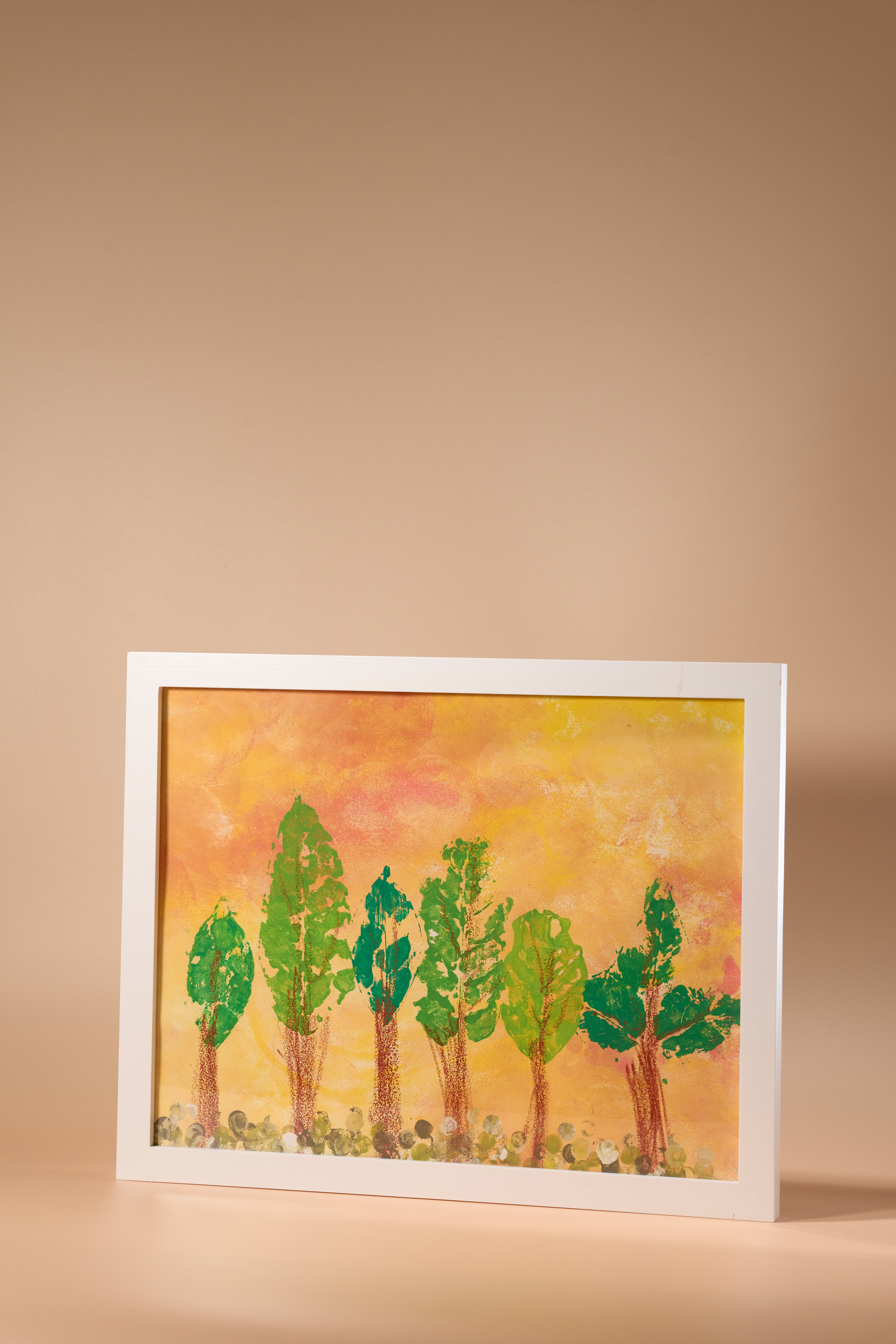 作品以橙黃天空為背景,葉子拓印一排綠意盎然的樹木,展現日落時分的寧靜與美麗,營造出自然生機與和諧氛圍。地面點綴的圓形元素增添細節與趣味,使整體構圖更具層次。作品突顯出自然與藝術的融合,喚起觀者對大自然的共鳴與敬意。