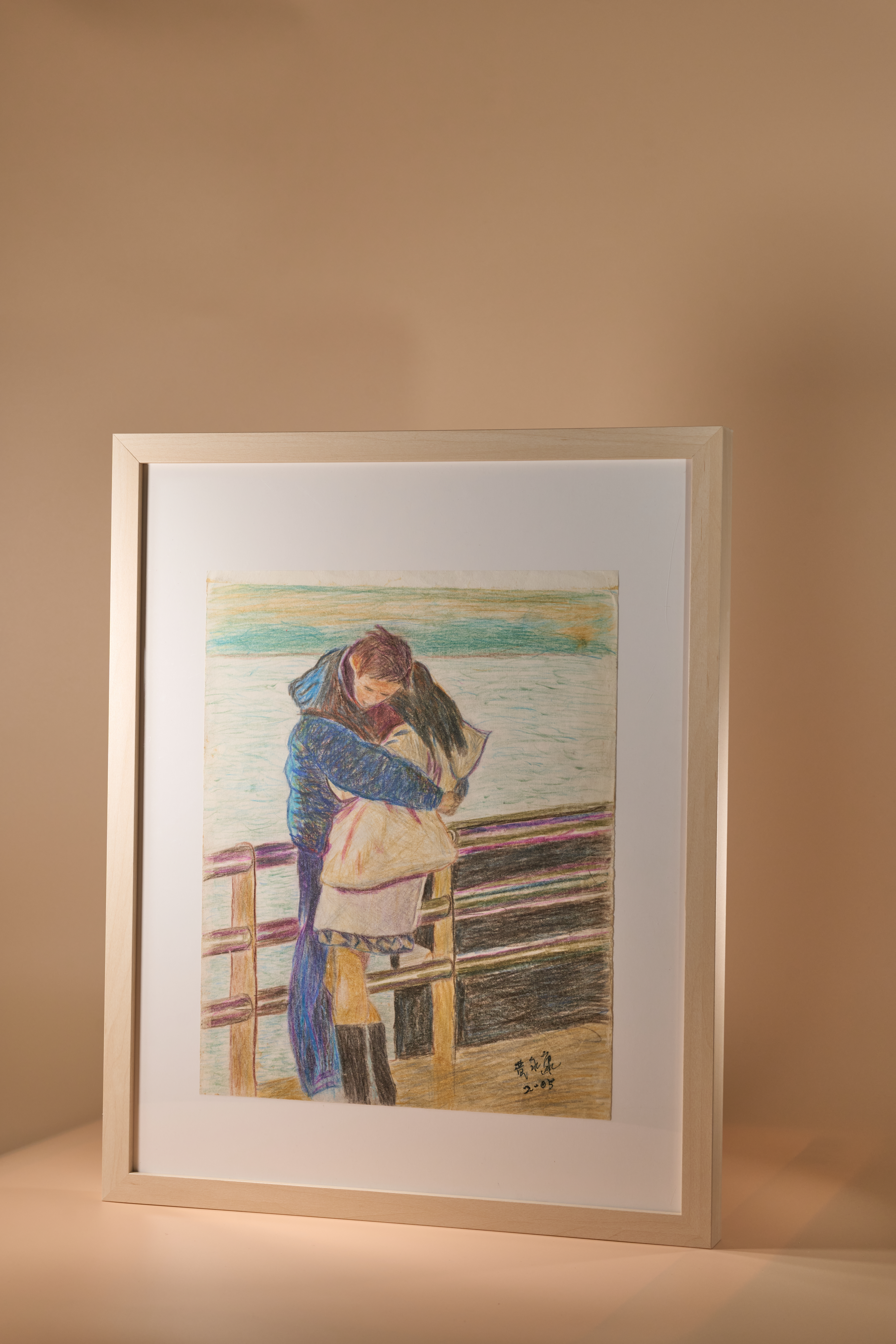 作品以西貢碼頭一對緊緊相擁在一起的情侶作背景,年輕人對感情的投入、緊張及難離難捨之情觸動了他,他們就以木顏顏色,將實景與聯想結合起來。