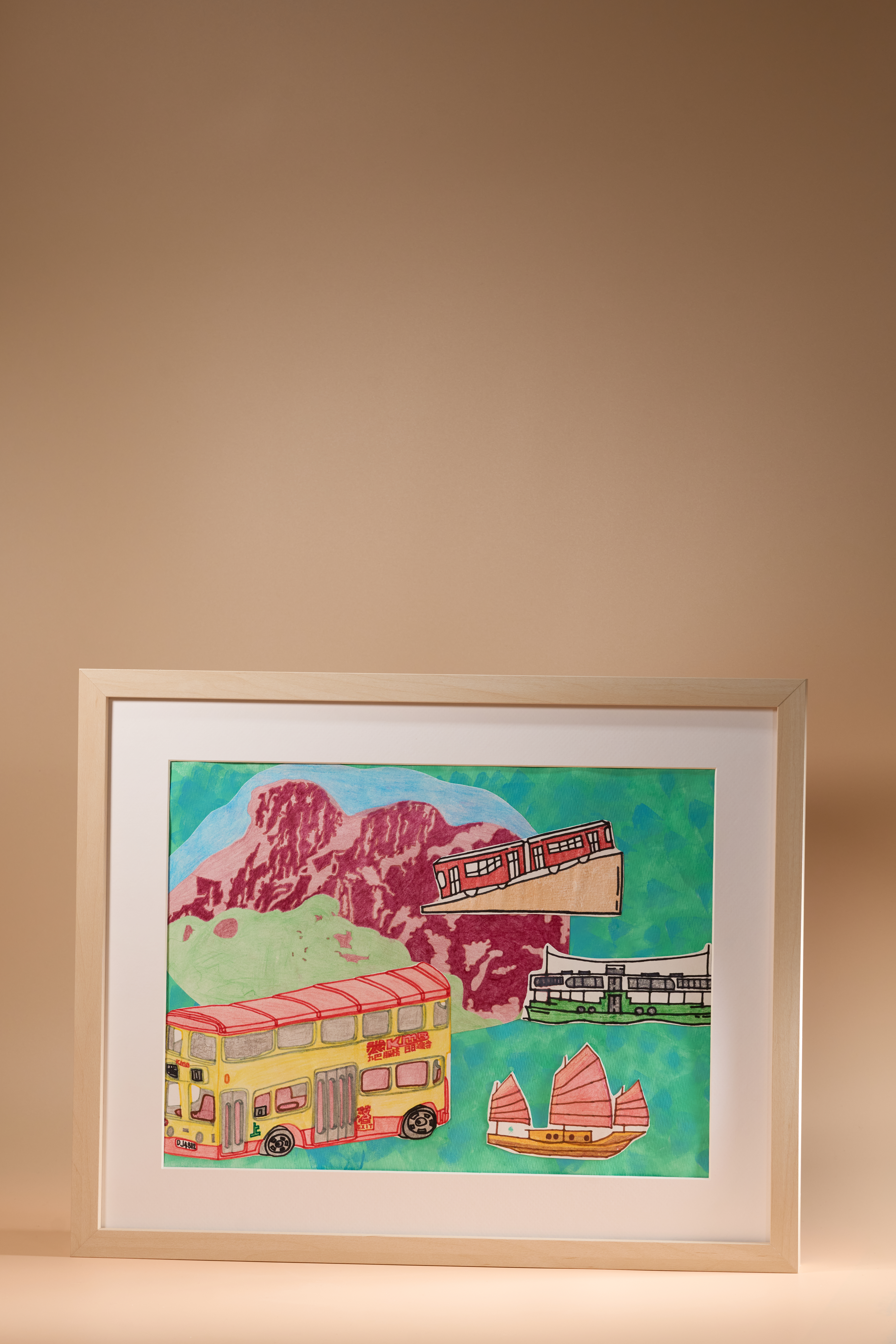香港的繁榮,有賴健全的交通網絡,作者以多種有歷史代表性的交通工具為題,齊聚獅子山下,盡顯藝術家對香港的情懷。 作者: 李敬滿 敬滿擅長以點、線、面方式,實物描繪畫為主,如公共交通和建築物等等。 單位名稱: 盛康綜合職業康復服務中心 作品種類: 水彩筆及木顏色 作品尺寸: 29.7 cm (h) x 42 cm (w)