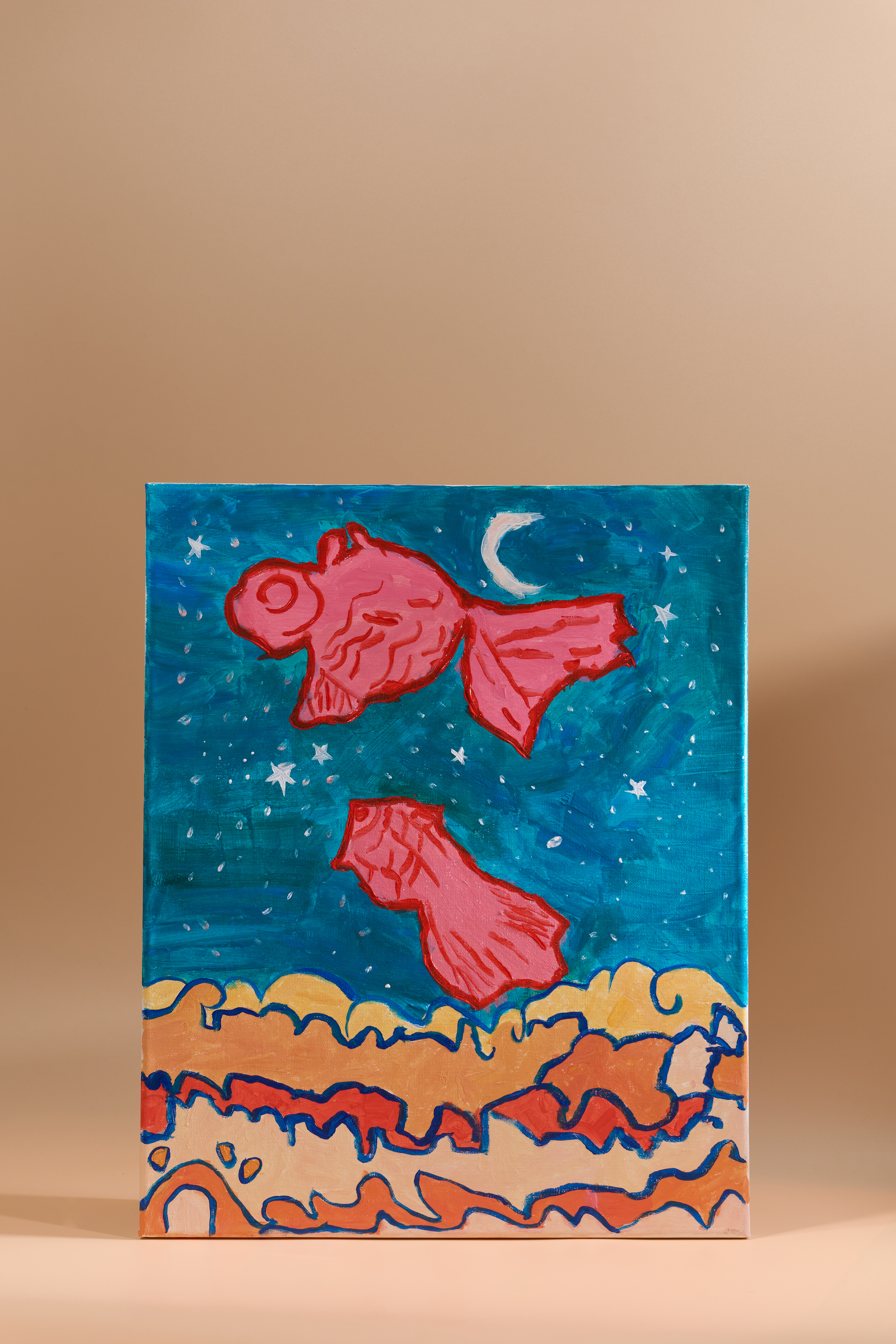 星空與水中世界可以混為一體?金魚都可變成外星人?只要有創造力量同幻想,自會驚喜不斷!作品以多種色彩畫出金魚在幻想世界遊覽。幻想世界的海水是彩色,配以星空背景,呈現出奇妙而獨特的想法。