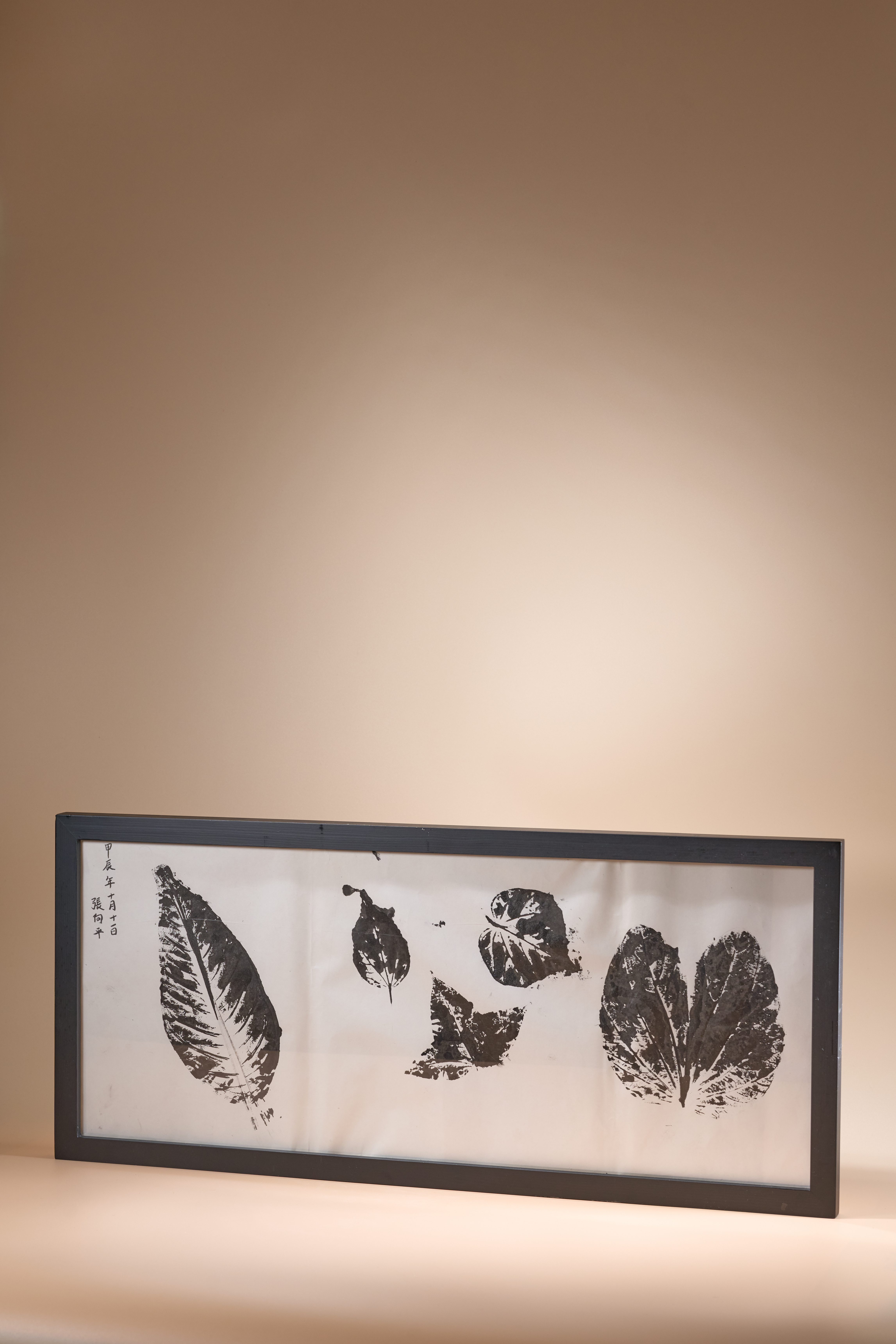 作品以黑墨拓印繪成,葉子品種各異,但均以黑白形相示人,葉片橫向排列,構圖簡潔而富節奏感,彷彿在靜謐的早晨中傾聽自然的低語,希望引起賞畫者對季節更選與生命流轉的思索。