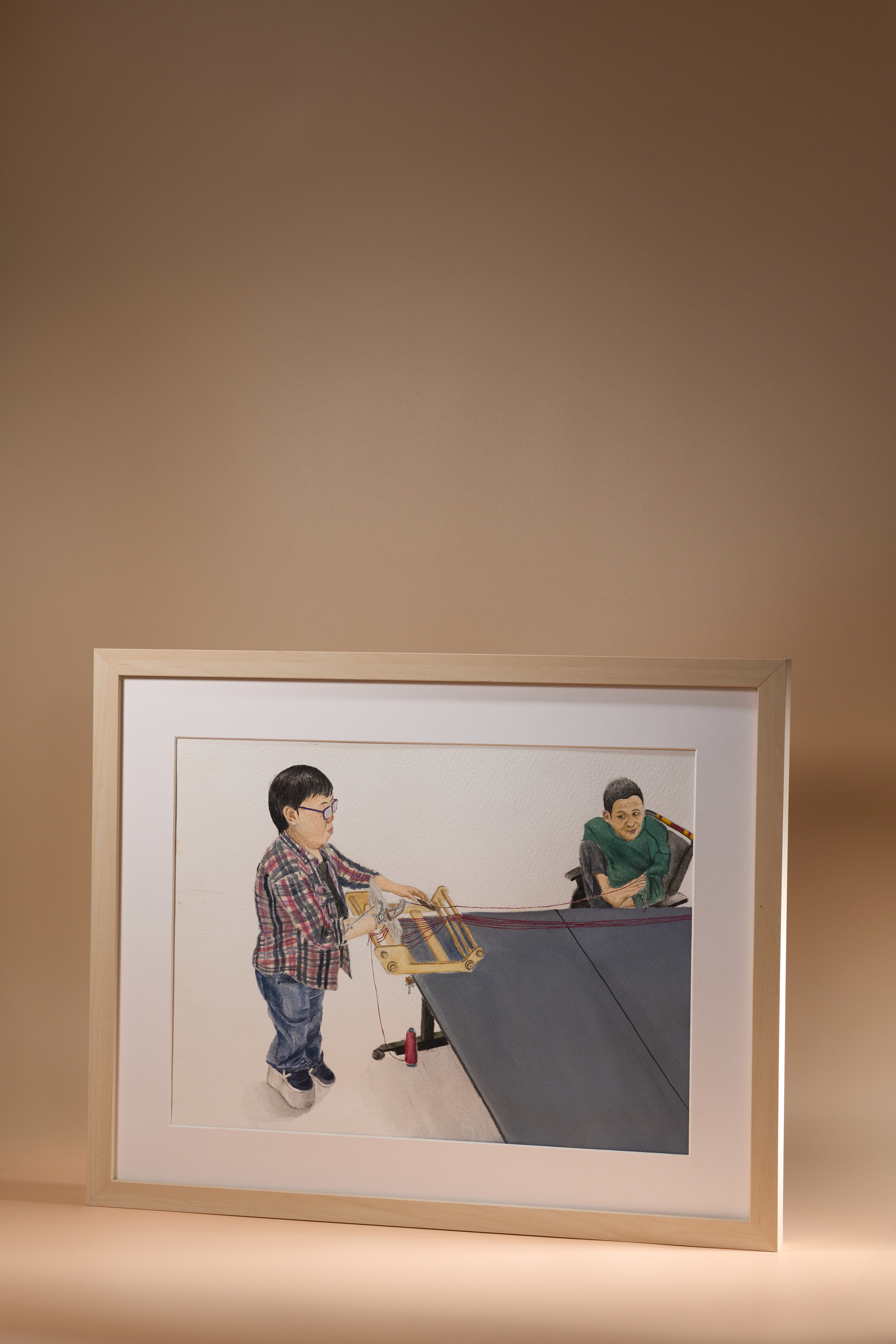 畫中右邊以腳代手的男子,是作者同爲藝術家的好友,畫中左邊單手的女子是他的工友。他們互相扶持完成了不可能的織布工序。 作者:郭啓業,他自幼失去右半身的活動能力,但無阻他發揮藝術天份。他擅長素描,對景物觀察入微,尤以鋼筆畫及水彩畫能夠表現到他細膩的筆跡。 單位名稱: 禾輋工場 作品種類: 水彩紙本 作品尺吋: 40cm (H) x 50cm (W) 註: 1. 每件藝術作品均由協會的服務使用者創作,將以先到先得形式確認。 2. 藝術作品實物可能與照片略有差異,敬希垂注。 3. 每件作品均附有尺吋資料以供參考。 4. 捐款可獲發正式收據作為稅務減免。 5. 作品將於慈善藝術展覽結束後約2個月內送交予善長。 6. 請於送貨地址一欄填寫正確郵寄地址,以便我們將藝術品送達。 7. 協會十分感謝善長的捐獻,捐款一經確認,恕不退還。 8. 如有任何爭議,協會保留一切權利。