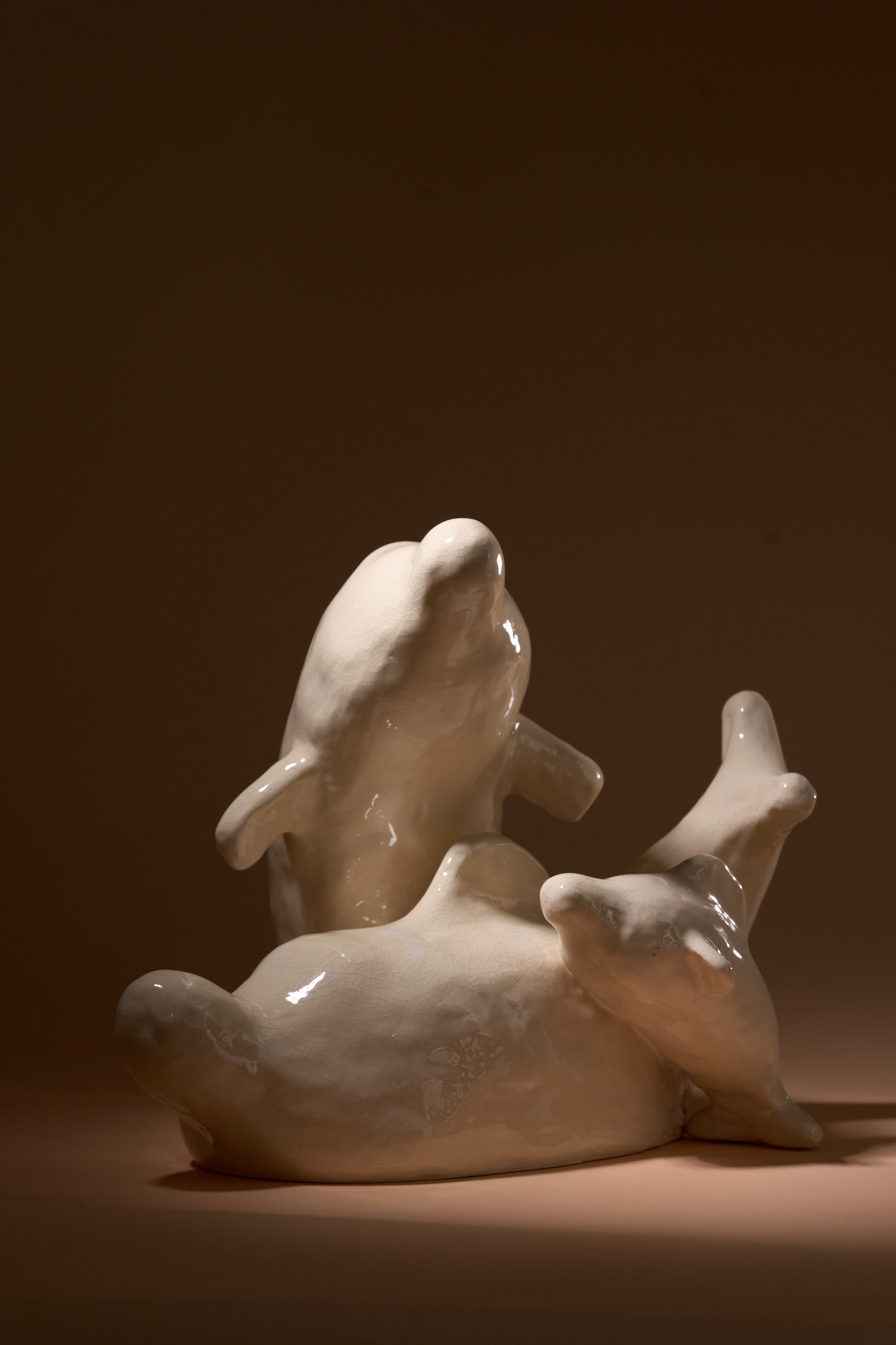 三隻海豚快樂相依,彼此守護也互相陪伴。牠們沒有華麗的色彩,單色的形態傳遞純淨、真摯的愛。