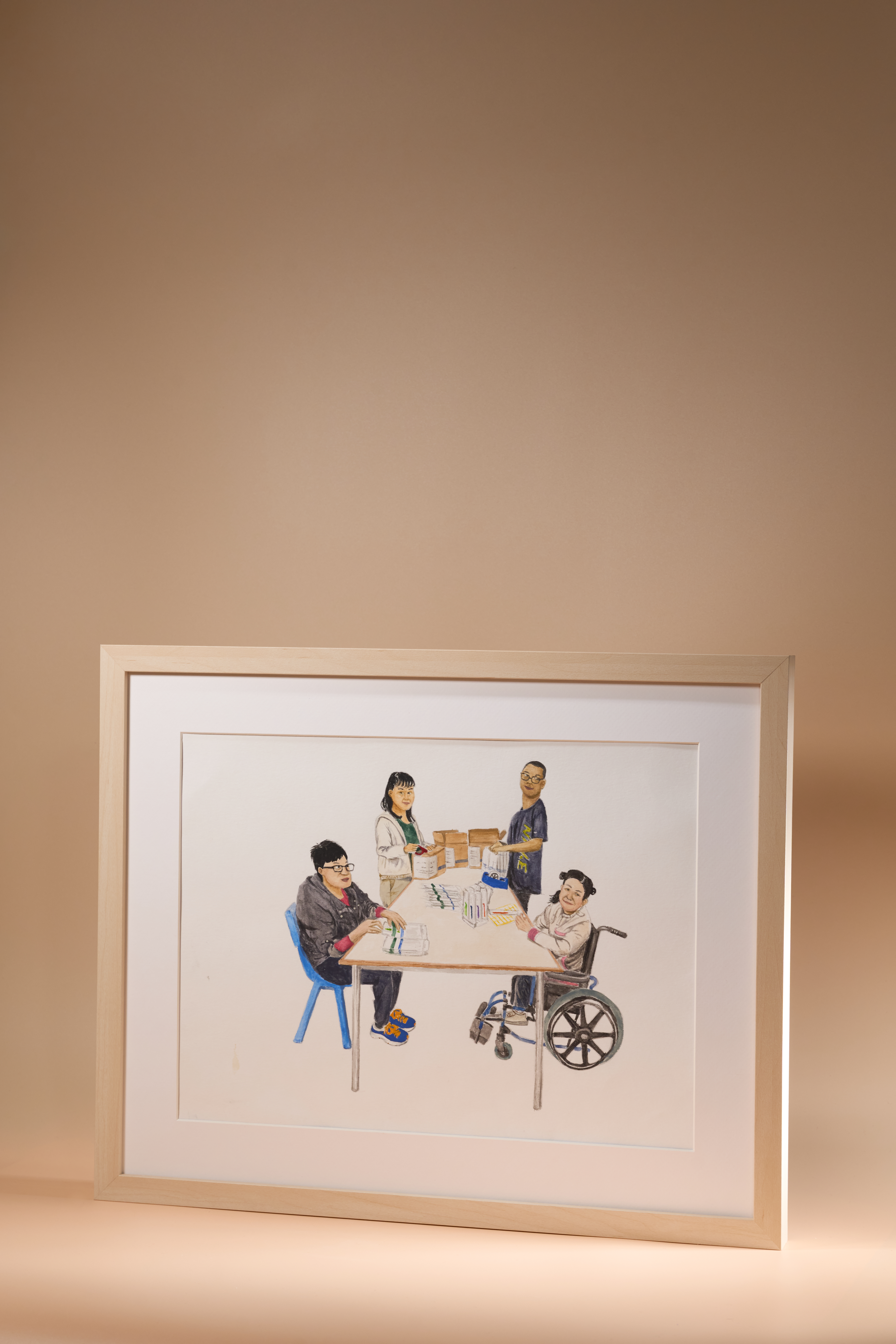 作品以工場之日常為主題,以水彩刻畫每天情景,從而表達人與人之間的關愛,畫中所見各人分工合作,生動展現團結精神的可愛。