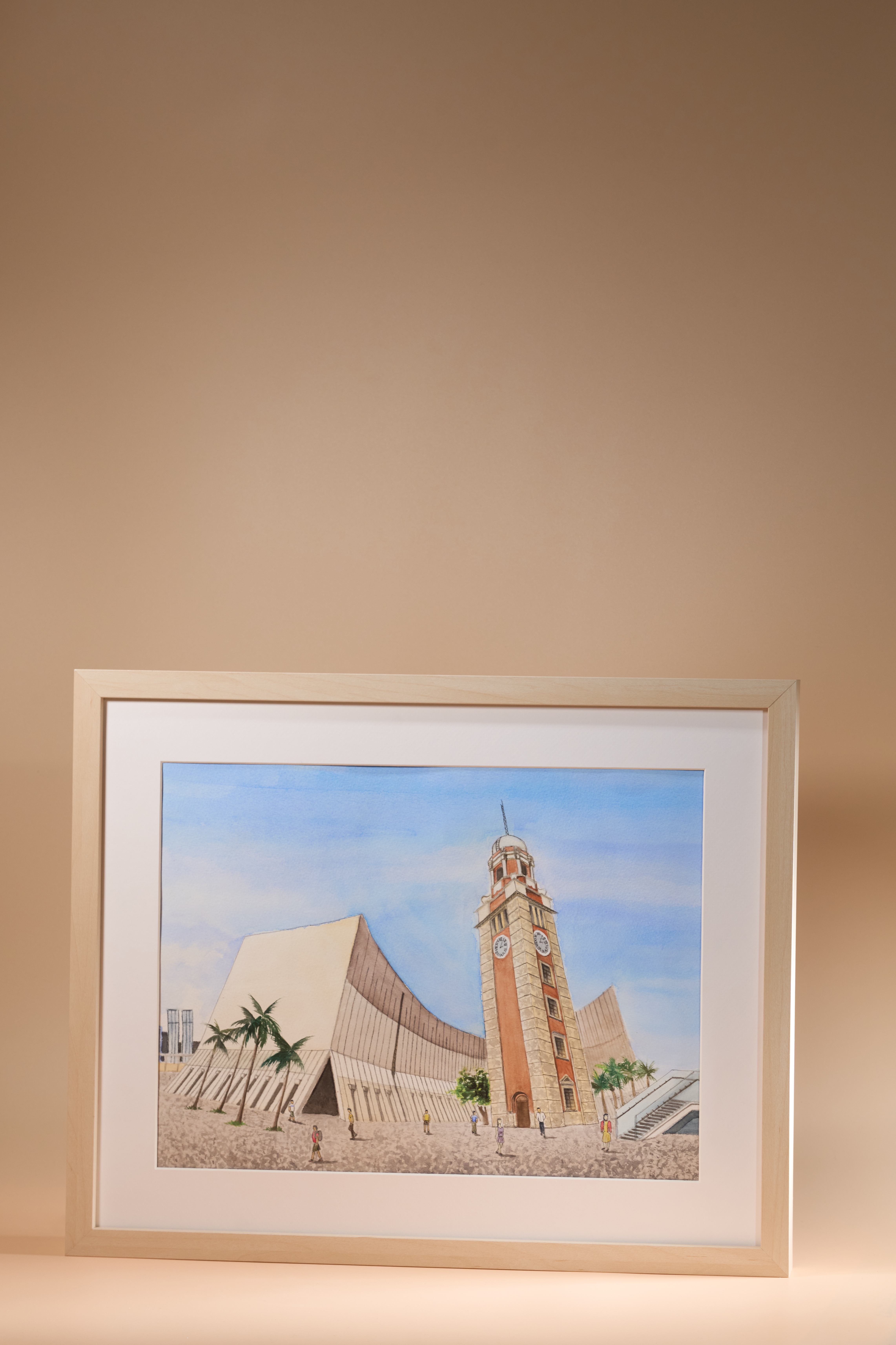 作者巧妙地以類似「魚眼鏡」的角度,描繪香港文化中心和鐘樓,以有趣的新角度與大家欣賞這兩幢香港地標,表達他對自身成長地方的一份愛。