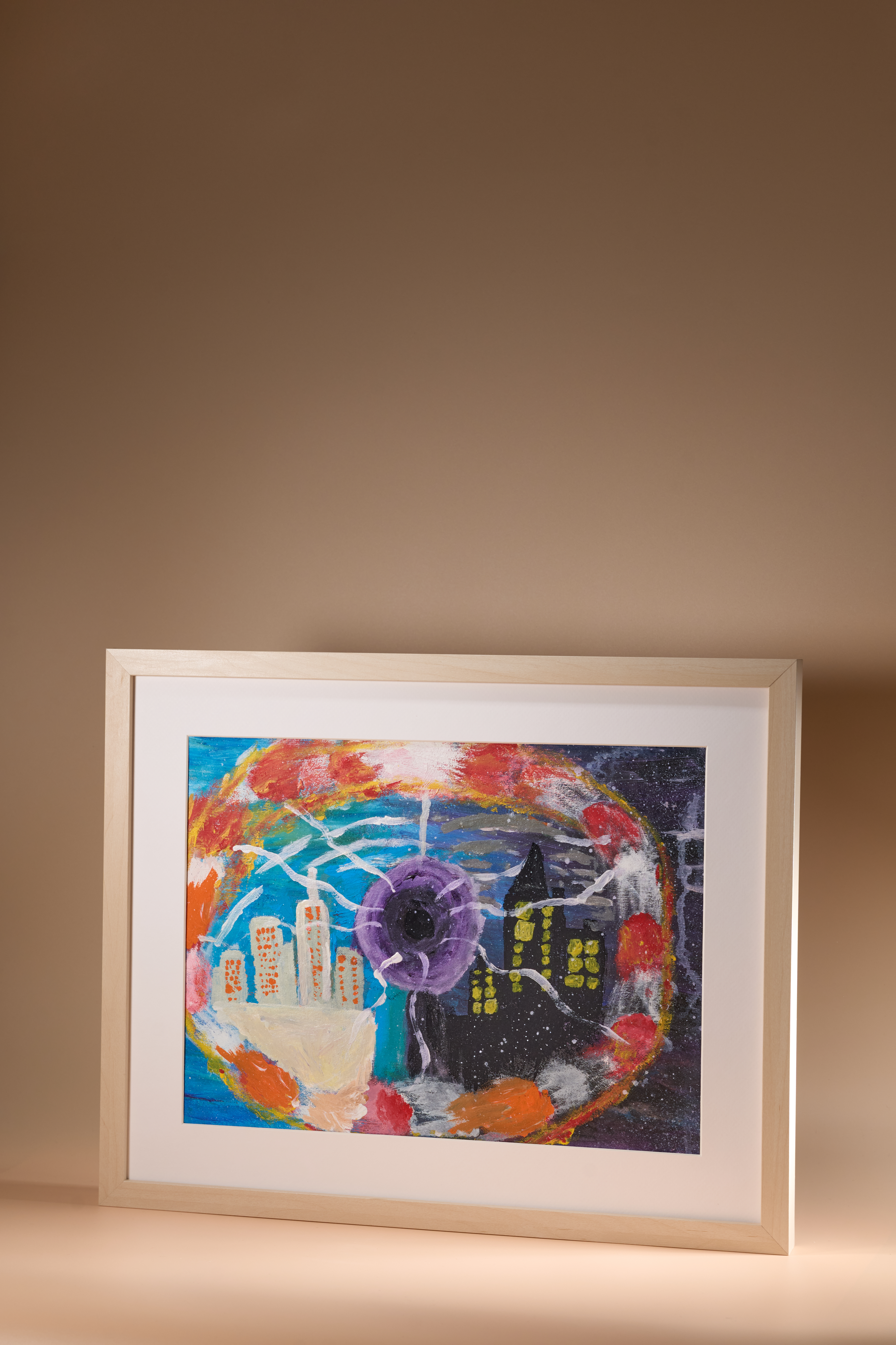 畫面中央是學生的眼晴,眼中所見是這個城巿的日和夜,摩天輪在日夜間高速運轉,讓整個城巿充滿活力。在作者的「眼」中,城市不論日夜都充滿幹勁,令作者神往不已。